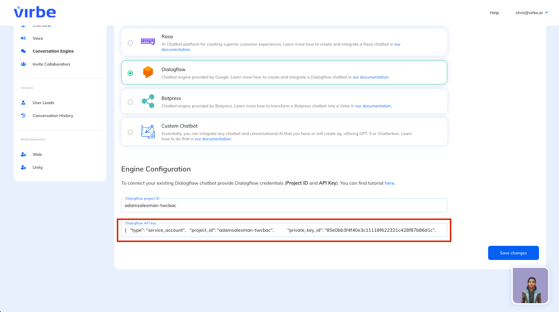 - Open the Dialogflow API Key JSON on your computer in any editor you like (e.g. Notepad or IDE) and copy-paste the contents into the Virbe Dashboard.