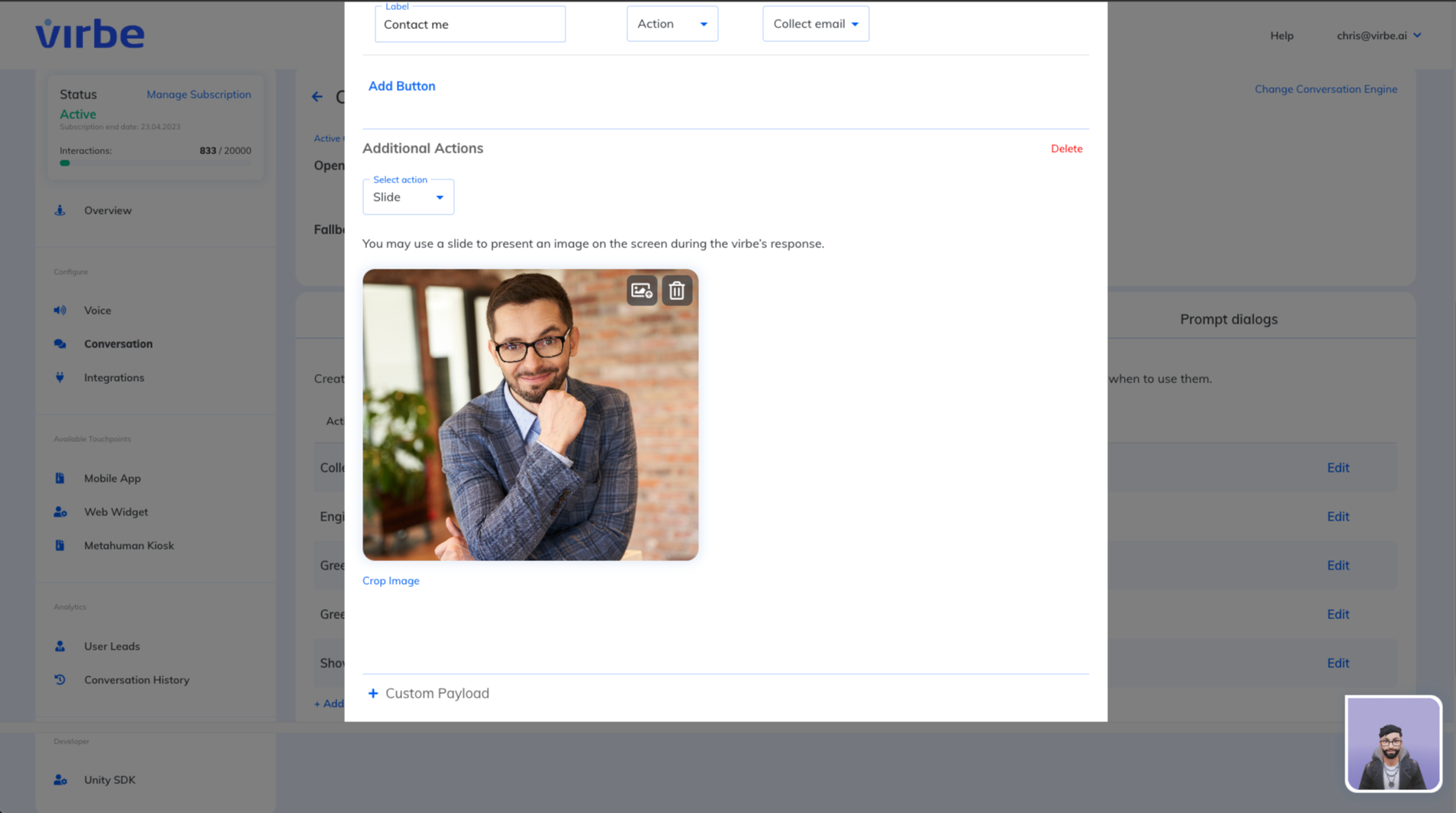 Are you looking to add a personal touch to your virtual assistant? Simply adding a model isn’t enough - you need to teach your virtual being its personality, role, and about your business. Luckily, with Virbe Dashboard, this process is a breeze. Take control of your virtual assistant’s development and watch as it becomes an integral part of your team. Don’t settle for a generic virtual assistant - customize and personalize with Virbe.