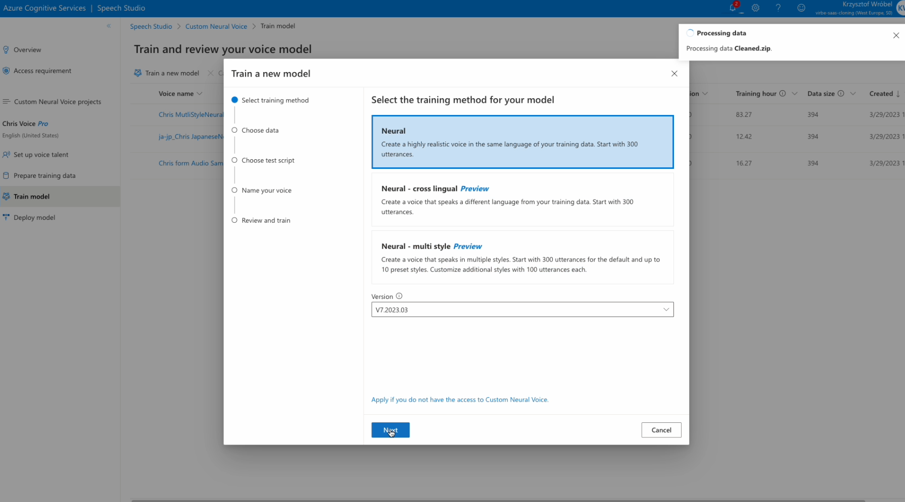 Once you have a necessary dataset you can continue the process in Azure Speech Studio First, you import the necessary audio clips, and after you've done reviewing and cleaning the dataset from low-quality samples you can continue with the training.